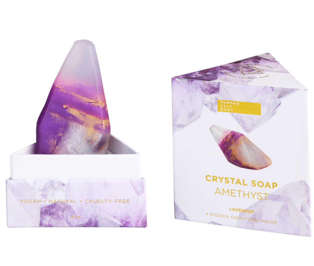 Inspired by the Amethyst crystal, this Crystal Soap is a luxurious way to wash and cleanse your skin. Hidden inside? A genuine amethyst gemstone to treasure! Amethyst is known to protect against negative energy. It reminds us to always treat the body and the mind as a sacred temple. It helps us rid unhealthy attachments and is wonderfully cleansing. Ingredients Aqua, Sorbitol, Sucrose, Sunflower Oil, Glycerine, Stearic Acid, Coconut Oil, Lavender Essential Oil, Propylene Glycol (food grade), Violet 2 (Cl 60725), Bronze Powder (Cl7740000)