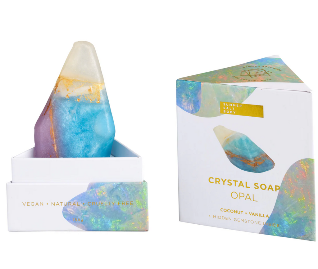 Inspired by the Opal stone, this Crystal Soap is a luxurious way to wash and cleanse your skin. Hidden inside? A genuine opalite gemstone to treasure. Opal is known to inspire originality and boost creativity. The energies of this stone will also encourage you to express your true self. You will feel confident and comfortable in your own skin, and this will radiate in your words, thoughts, and actions. Opal is a karmic stone that will show you that everything you put out there in the universe has a way of coming back to you. Ingredients Aqua, Sorbitol, Sucrose, Sunflower Oil, Glycerine, Stearic Acid, Coconut Oil, Natural Coconut Fragrance, Vanilla Essential Oil, Propylene Glycol (food grade) Blue 4 (Cl 42090), Violet 2 (Cl 60725), Bronze Powder (Cl7740000).
