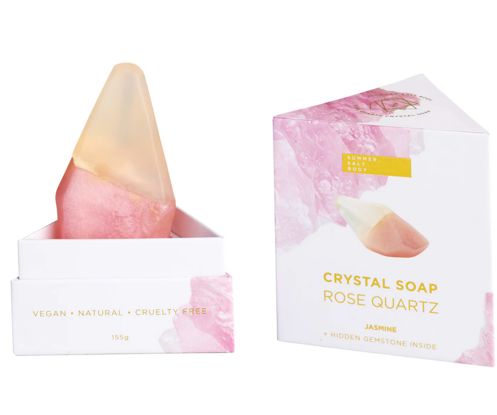 Inspired by Rose Quartz, this Crystal Soap is a luxurious way to wash and cleanse your skin. Hidden inside? A geniune rose quartz gemstone to treasure, the ultimate love vibe. Known as the Love Stone. Rose Quartz possesses energy related to the heart chakra and will enhance your self love as well as the love you have for others. It carries a gentle and soothing energy to heal and promote inner peace. INGREDIENTS Aqua, Sorbitol, Sucrose, Sunflower Oil, Glycerine, Stearic Acid, Coconut Oil, Jasmine Essential Oil, Propylene Glycol, Orange 4 (Cl 15510), Bronze Powder (Cl7740000)