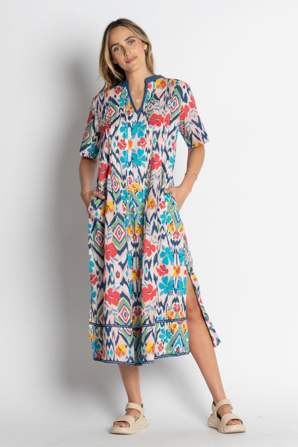 The LulaLife Kabira Midi Dress is a versatile cotton style designed in Australia for effortless summer dressing. Crafted from breathable 100% cotton, it features a relaxed fit with a Nehru collar flowing into a flattering V-neckline. Vertical tucks on the bodice create subtle detailing, while side pockets and above-elbow sleeves add everyday practicality. Side splits allow ease of movement, and the braid trim on the hem gives a playful finish. Falling to a midi length, this dress is perfect for casual outings, beach days, or holiday wear. Relaxed fit Nauru collar with V-neck Vertical tucks on bodice to waist Side pockets Side splits Above elbow length sleeve Braid trim on hem 100% cotton Designed in Australia