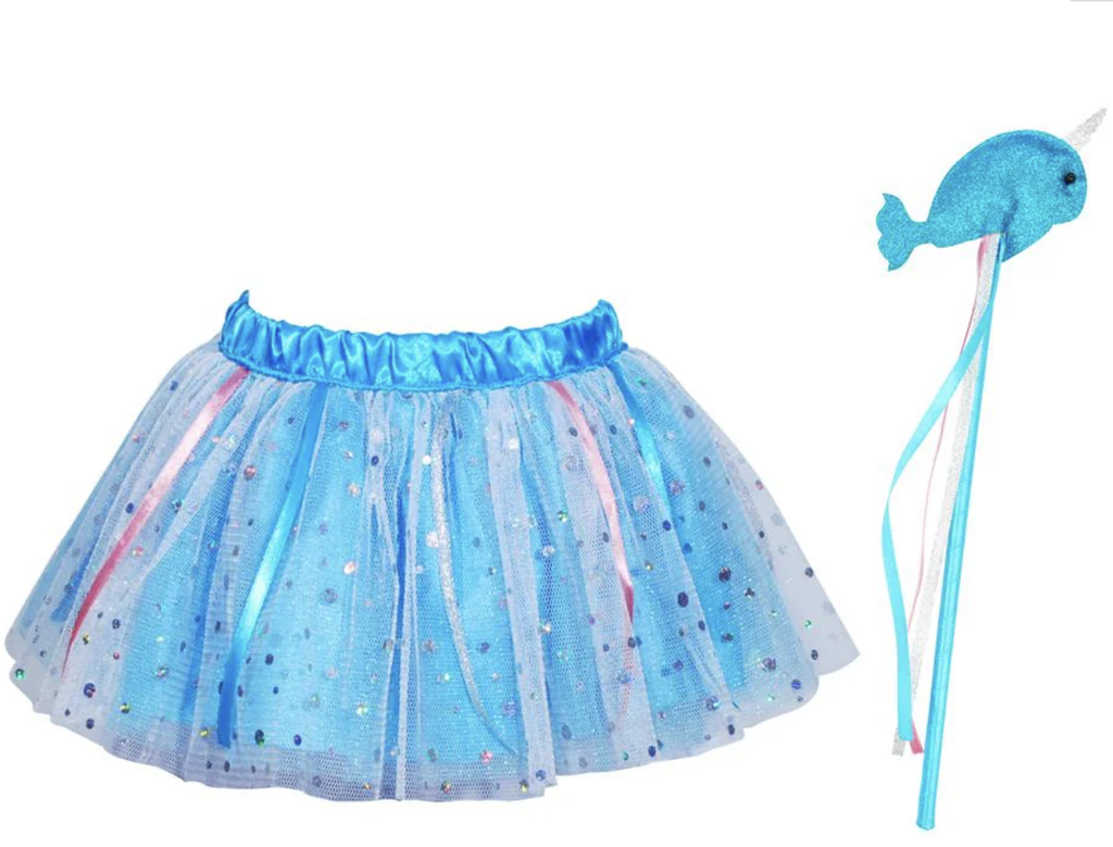 Wish Upon A Star Tutu & Wand Set-Blue is just tutu-cute! Be a mermaid or unicorn of the sea with this sea-themed dress upset. Includes an adorable mini multi-layered tutu and narwhal wand. Tutu consists of 2 soft mesh layers, the top with holographic sequin bubbles and an array of dangling coloured ribbons. It is satin lined with a satin elasticised waistband. The satin stick wand is topped with a cute glittery narwhal and dangling coloured ribbons. - 2 piece set - Multi-layered, satin-lined mini tutu - Handmade wand - Skirt 100% polyester - Suitable for ages 3-5 - Gentle handwash